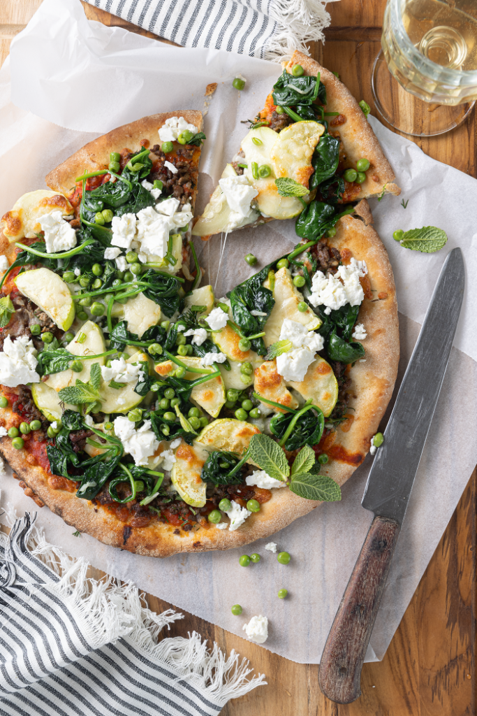 - Roerbak ondertussen de spinazie in 4 minuten gaar en laat goed uitlekken in een vergiet. Haal de pizza’s uit de oven en verdeel de spinazie, de doperwten, blaadjes munt en feta eroverheen. Eet smakelijk!