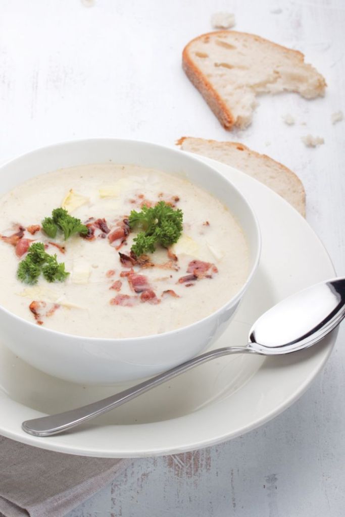 Snijd de witlof in stukjes. Verwarm de olijfolie in een pan en bak de ui en knoflook glazig. Voeg de witlof toe (houd 1 stronk achter voor garnering) en bak 1 minuut mee. Blus af met bier en kippenbouillon en voeg de aardappel toe. Laat 10 minuten zachtjes koken, tot de aardappel gaar is. Pureer de soep met een staafmixer. Voeg daarna de room, peper en nootmuskaat naar smaak toe. Bak ondertussen de spekjes knapperig in een koekenpan. Vul de koppen met de achtergehouden fijngesneden witlof, voeg de soep toe en garneer met de gebakken spekjes en een toefje peterselie. Eet smakelijk!