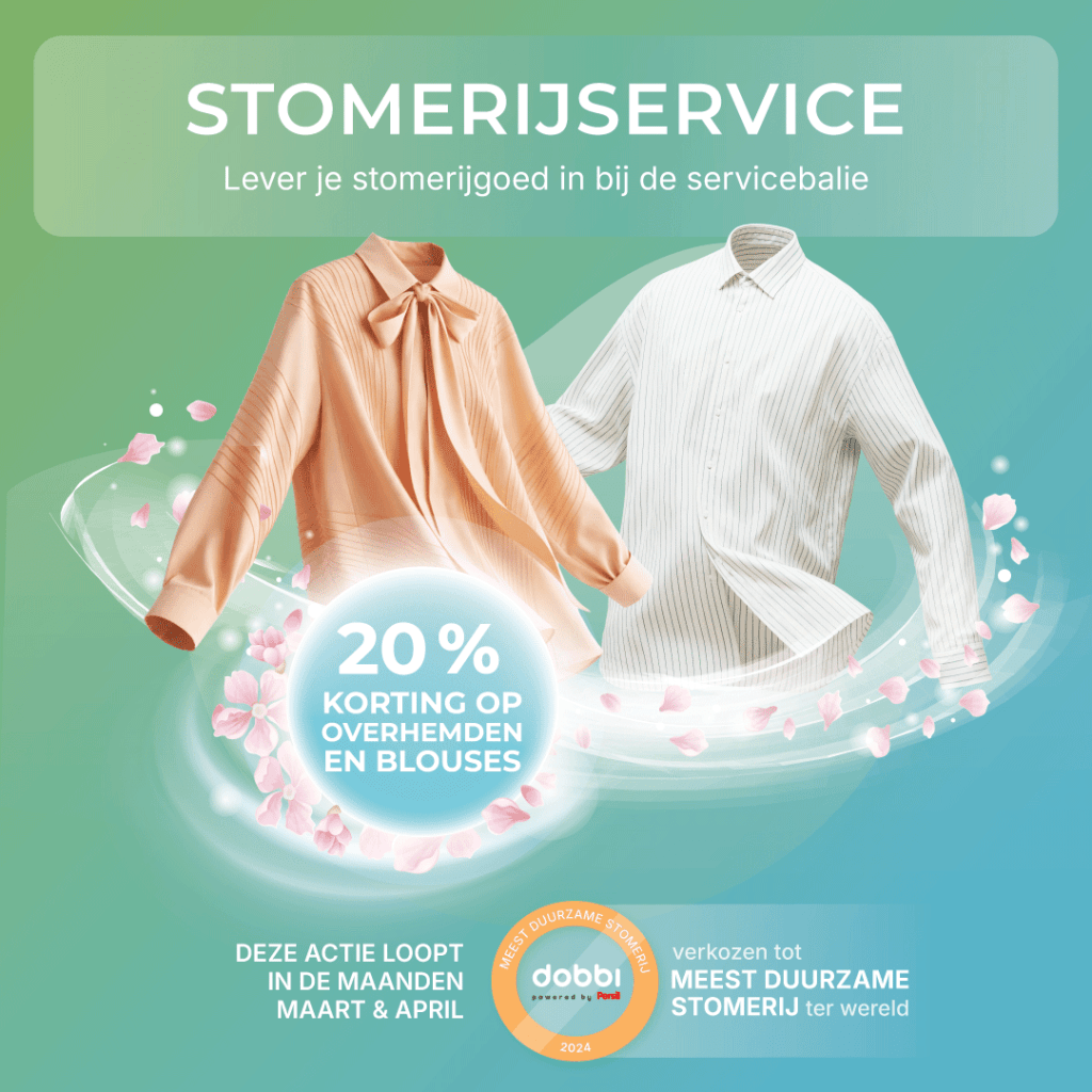 In de maanden maart en april ontvangt u 20% korting op het stomen van u overhemden en/of blouses.
