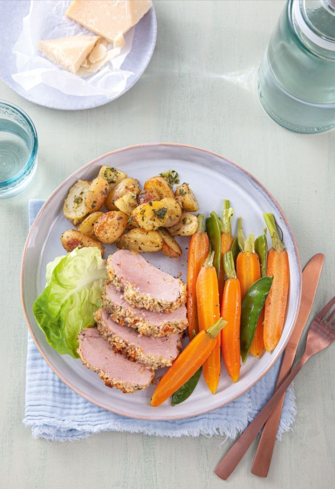 Hoofdgerecht - Lente- 4 personen - 30 minuten bereiding Serveer tip recept-varkenshaasje-worteltjesPDF weekrecept Ingrediënten 2 varkenshaasjes 1 bos worteltjes 200 gr peultjes 300 gr krieltjes 1 bakje pesto verde 1 stuk Parmezaanse kaas panneermeel zout en peper knoflookpoeder nootmuskaat maggi boter 2 eieren bakpapier Bereiding Laat de varkenshaasjes op kamertemperatuur komen. Kook de krieltjes 10 … Meer lezen over Varkenshaas met worteltjes en krieltjes