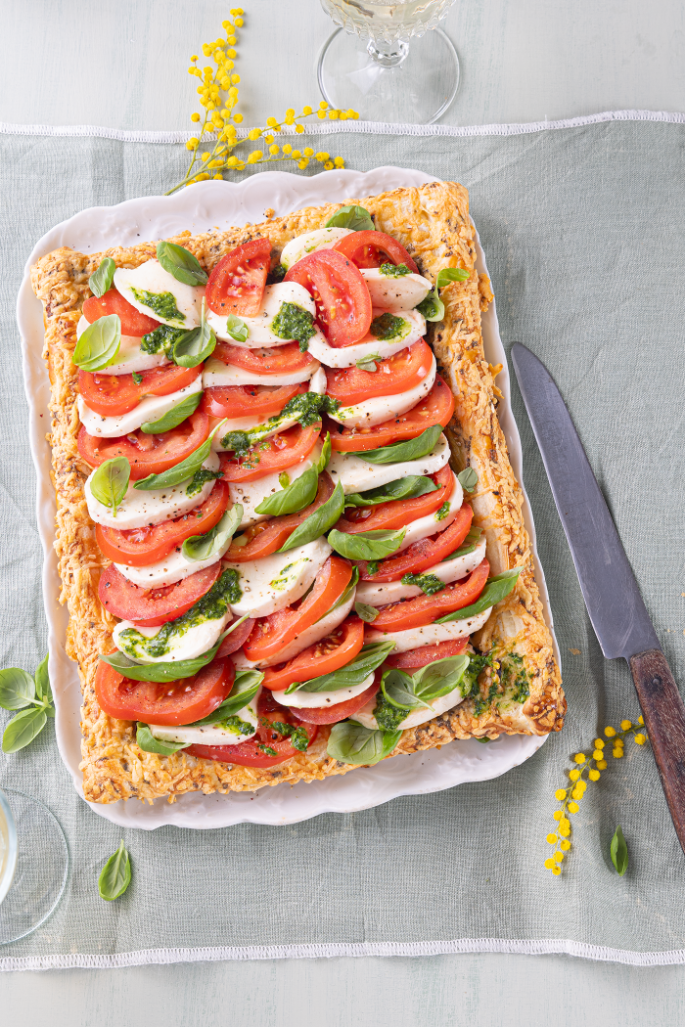 Bladerdeeg taart caprese met mozzarella, tomaat en basilicum