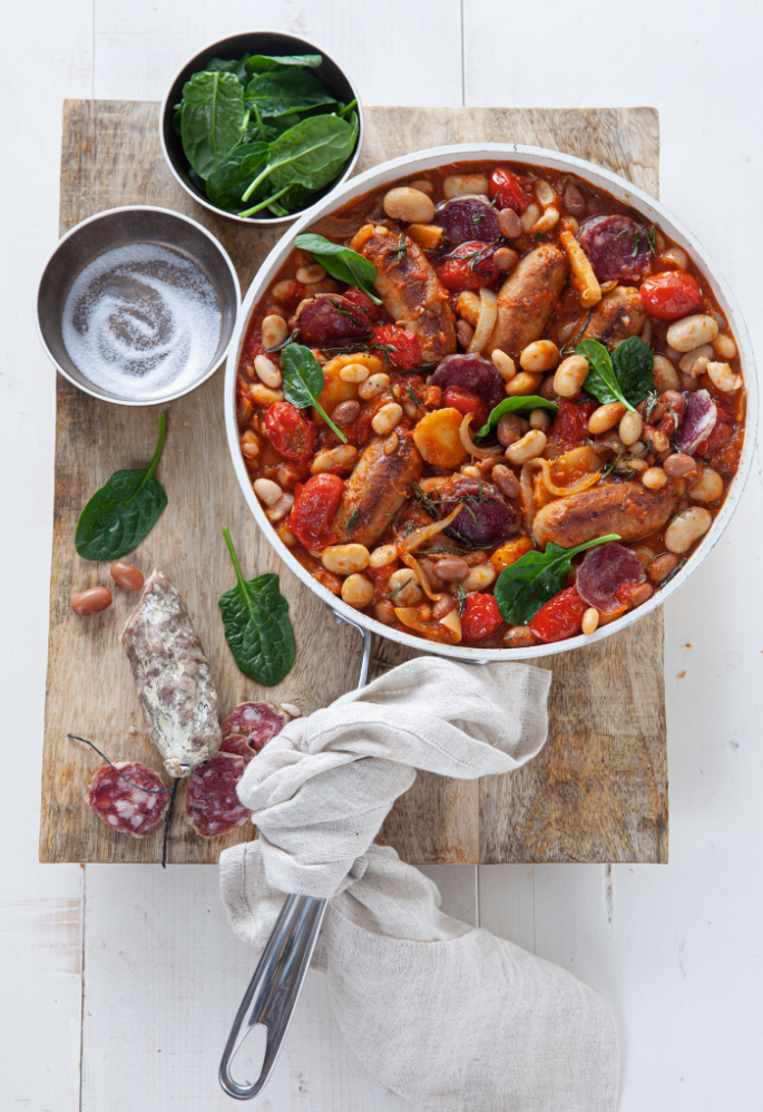 4 personen - 50 minuten bereiding Serveer tip Download hier het weekrecept als PDFPDF weekrecept Ingrediënten 2 uien 1 kleine knolselderij 8 kleine braadworstjes 4 teentjes knoflook 2 takjes rozemarijn 1 el venkelzaadjes 1 el paprikapoeder 1 runderbouillon tablet 2 blikken tomatenblokjes 2 el tomatenpuree 1 gedroogd worstje naar keuze 150 gram kerstomaatjes 400 gram … Meer lezen over Bonenstoof