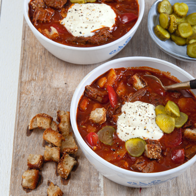 Hoofdgerecht - Winter - 4 personen - 50 minuten bereiding Serveer tip Download hier het weekrecept als PDFPDF weekrecept Ingrediënten 200 gr (restjes) draadjesvlees 2 rode paprika's 2 uien 1/2 rode peper 4 aardappels 50 gr macaroni 4 teentjes knoflook 2 tl karwijzaad 1 el paprikapoeder 1 el tomatenpuree 2 el wodka 1 l runderbouillon … Meer lezen over Goulashsoep met draadjesvlees