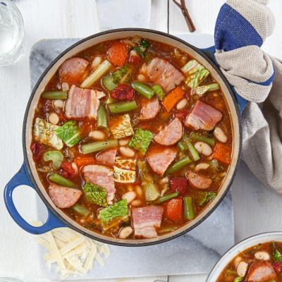 Hoofdgerecht - Winter - 4 personen - 50 minuten bereiding Serveer tip Download hier het weekrecept als PDFPDF weekrecept Ingrediënten 2 uien 6 el olijfolie 3 winterwortels 1/4 groene kool 200 gr boontjes 4 teentjes knoflook 2 el gedroogde majoraan 2 takjes rozemarijn 2 blikken tomaatblokjes stukje Parmezaanse kaas met korst stukje gerookte spek 4 … Meer lezen over Winter minestronesoep